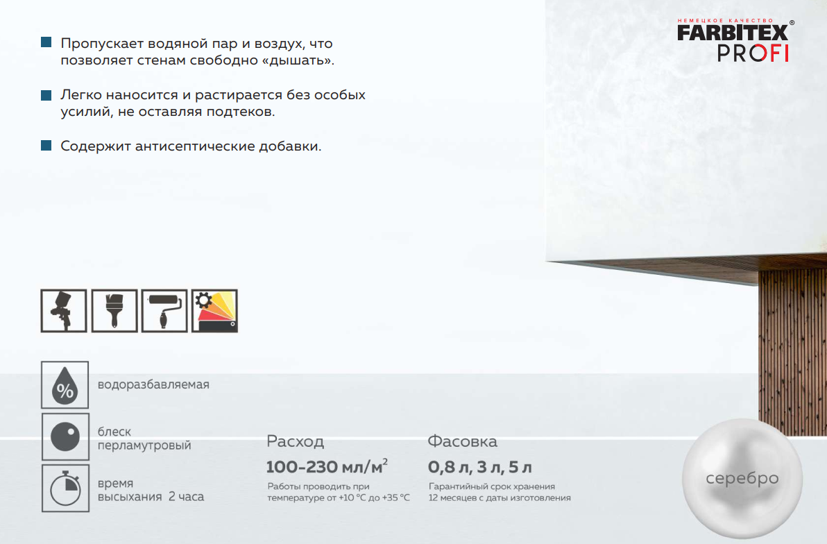 Расход декоративного покрытия варьируется от 100 до 230мл/м2 в зависимости от состояния, и способа нанесения.