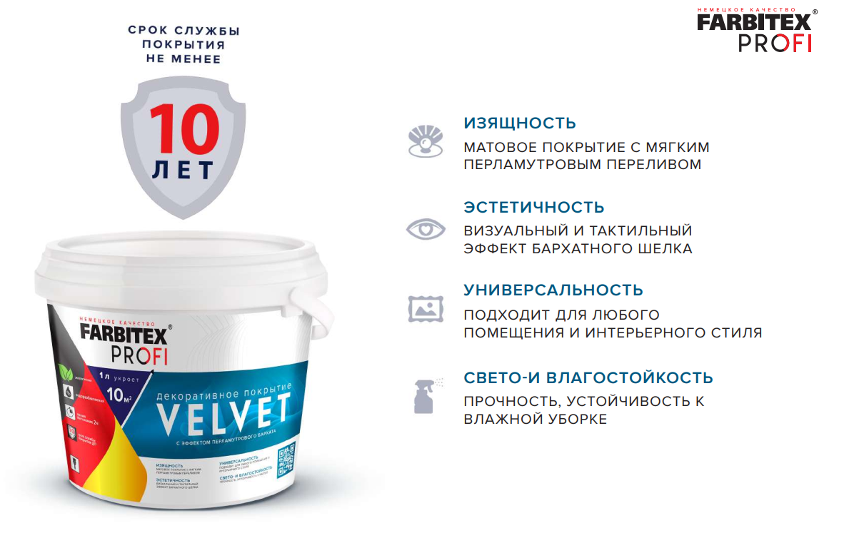 Высококачественное перламутровое бархатистое покрытие на основе акриловой дисперсии, для внутренних и наружных работ. Экологически чистое, водоразбавляемое, с отличной адгезией к большинству поверхностей. Отличается высокими декоративными и защитными свойствами. После нанесения образует разнотоновую поверхность, имитирующую бархат.