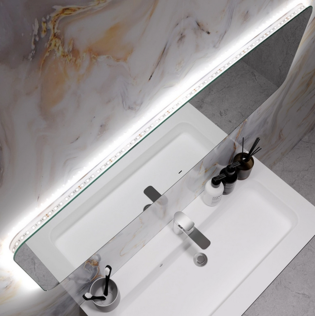 В качестве элемента подсветки используется светодиодная лента, которая обеспечивает яркое свечение по периметру зеркала.