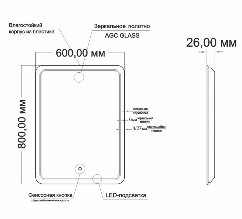 Все электрические компоненты размещены внутри корпуса из Abs-пластика, который защищает от влаги и механических повреждений. В качестве элемента подсветки используется светодиодная лента, которая обеспечивает яркое свечение по периметру зеркала. Зеркало влагостойкое и защищено от попадания случайных брызг и капель воды.