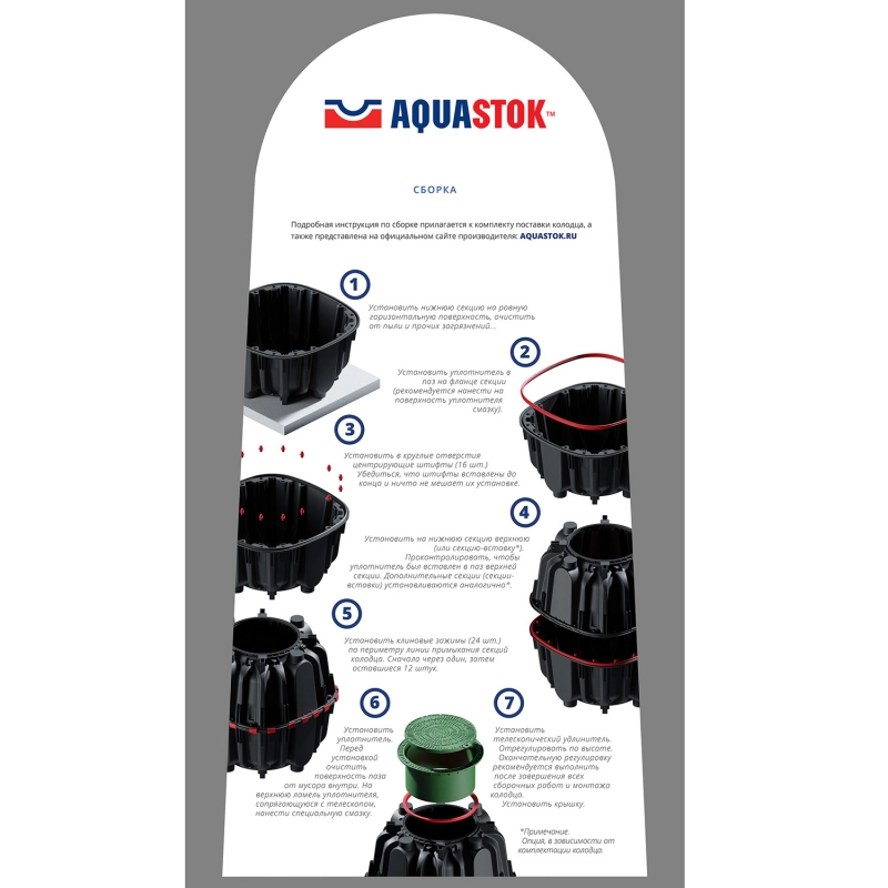 Колодец обладает полностью герметичной конструкцией благодаря уплотнительной резине (уплотнителю), которая устанавливается в стыках модулей. Этот элемент обеспечивает надежное соединение и гарантирует срок службы до 30 лет, так как резина защищена от воздействия УФ-излучения и не подвержена старению.