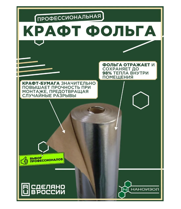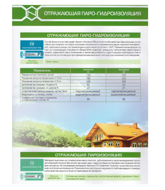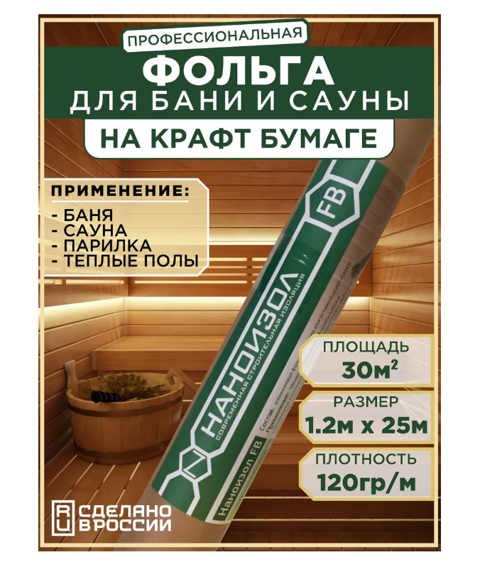 НАНОИЗОЛ FB – двухслойный материал, представляет собой алюминиевую фольгу, термически скрепленную с крафт-бумагой посредством полимера. Фольга обеспечивает полную непроницаемость для пара и отражает инфракрасное излучение, дополнительно сохраняя тепло, а бумага придает материалу механическую прочность. При устройстве бань и саун.
