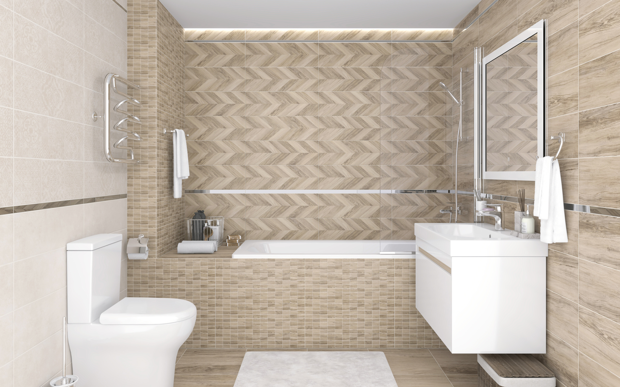 Коллекция Amber выполнена как имитация древесины в природном бежевом цвете. Это прекрасный вариант для оформления интерьера в экостиле.Базовая настенная плитка представлена двумя очень интересными модулями. Одна плитка имеет матовую фактуру, а если провести рукой по второй, то можно почувствовать рельефные древесные волокна. Плитка с укладкой плашек "ёлочкой” создаст интересное разнообразие форм дощечек. Мозаичный декор воспроизводит горизонтально уложенную плитку "кабанчик". Панно из шести элементов покрыто традиционными геометрическими узорами.