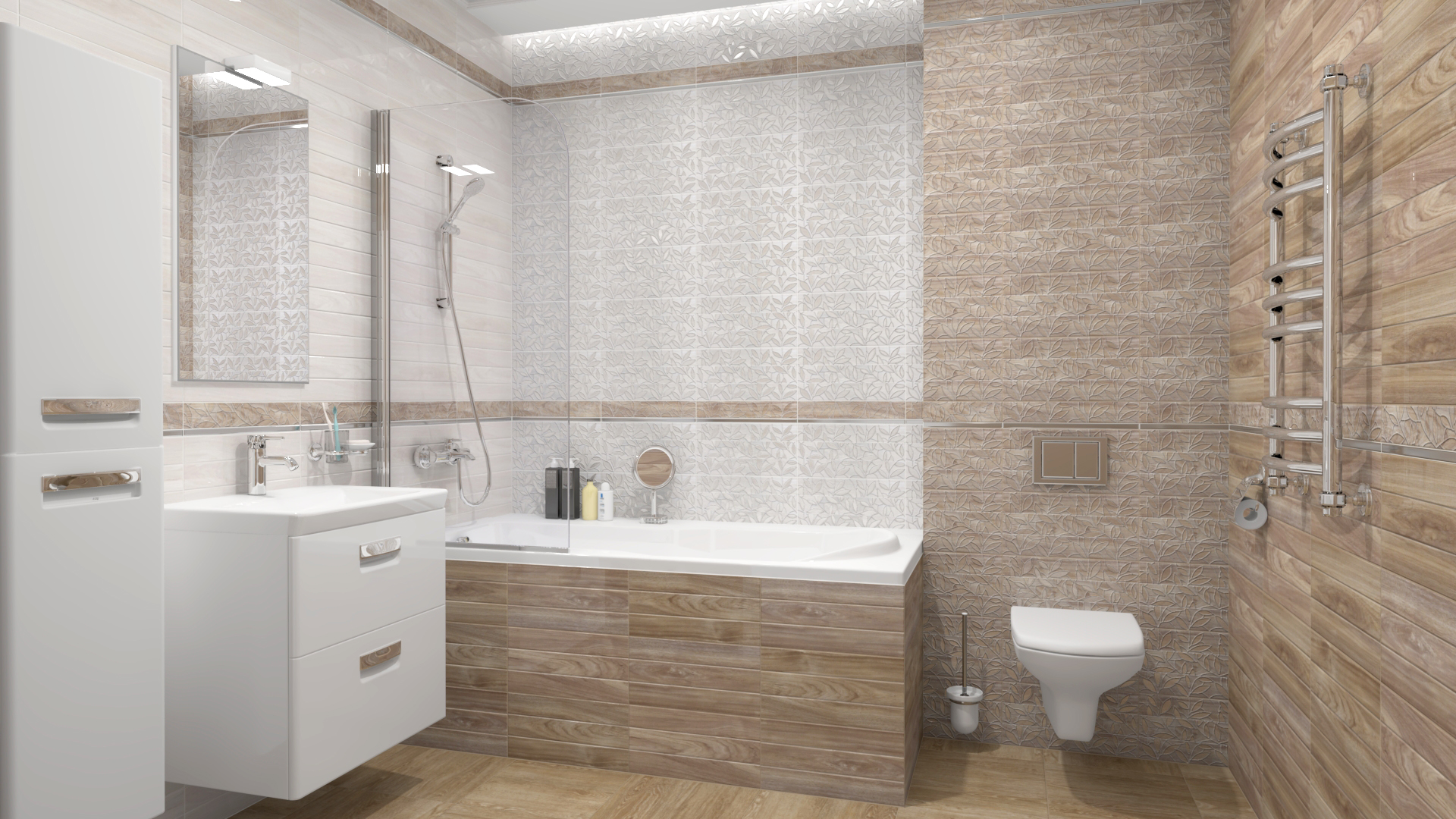 Коллекция Bona богата разнообразием тёплых и холодных оттенков. Цветовая гамма из бежевого, тёмно-бежевого, серого и тёмно-серого визуально расширяет пространство и наполняет ванную комнату мягким светом. Керамическая плитка имитирует дерево в виде сложенных вместе досок, напоминающих паркет или вагонку. Цвета максимально точно приближены к натуральным, с переливами оттенков и природными рисунками.