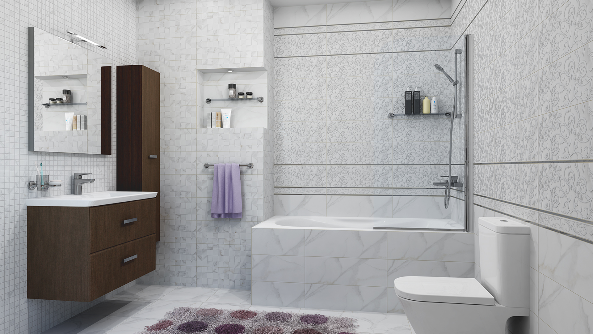Керамическая плитка имитирует каррарский мрамор с изящными прожилками. Настенная плитка 20х60 представлена в двух вариантах – модуль с гладкой поверхностью и трёхмерная мозаика. Элементы псевдомозаики лежат беспорядочно, как будто расположены на разных плоскостях, создавая игру света и тени. В коллекции также есть гладкая мозаика 30х30, которая отлично подойдёт для неровных поверхностей.