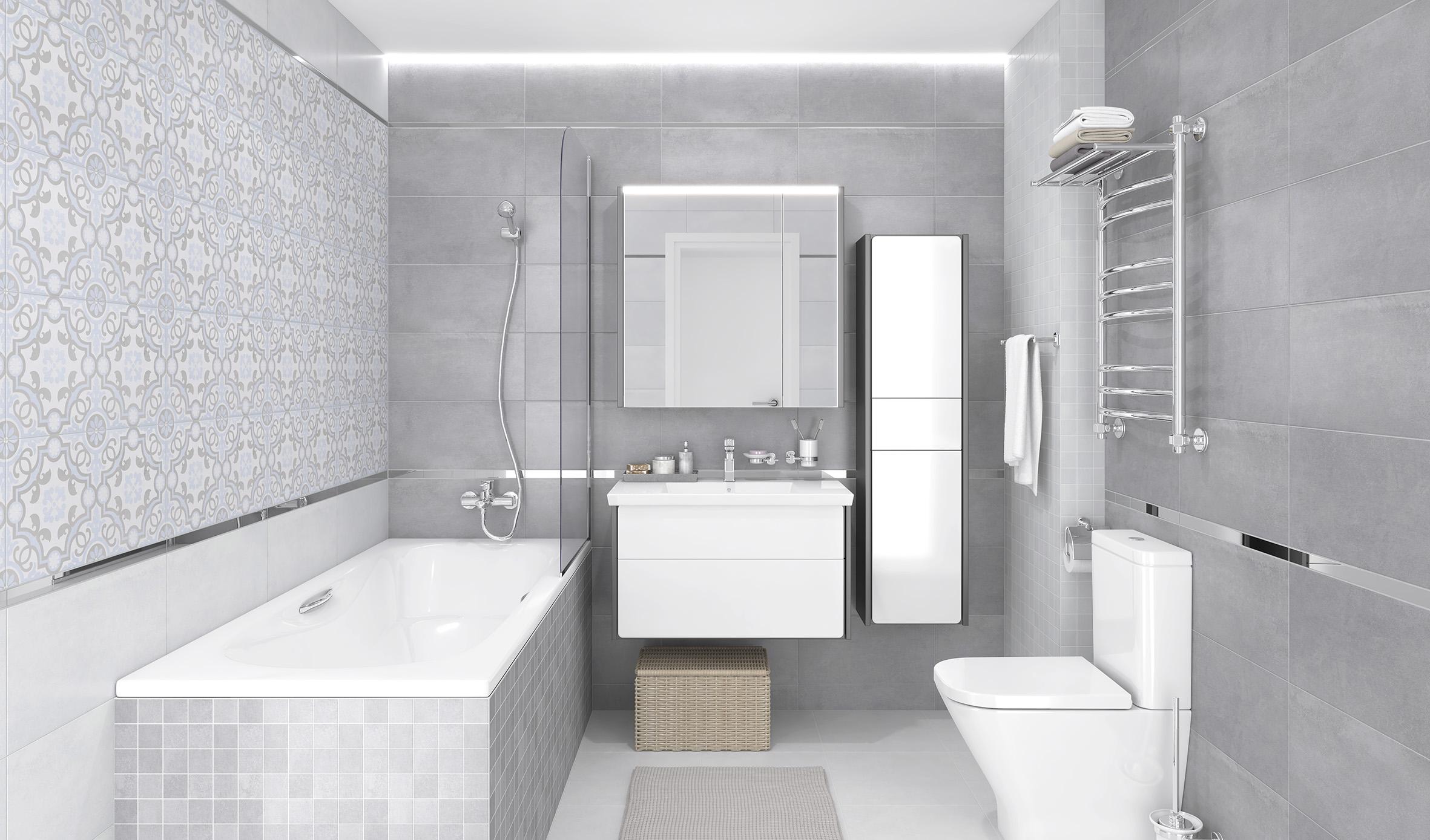 В зависимости от выбора декора коллекции можно получить абсолютно разные по стилю решения. Первый декор – плитка в полоску. Источник: https://laparet.ru Расплывчатые, будто сделанные баллончиком с краской, серого и синего цветов. Вертикальные полоски визуально сделают потолок выше.