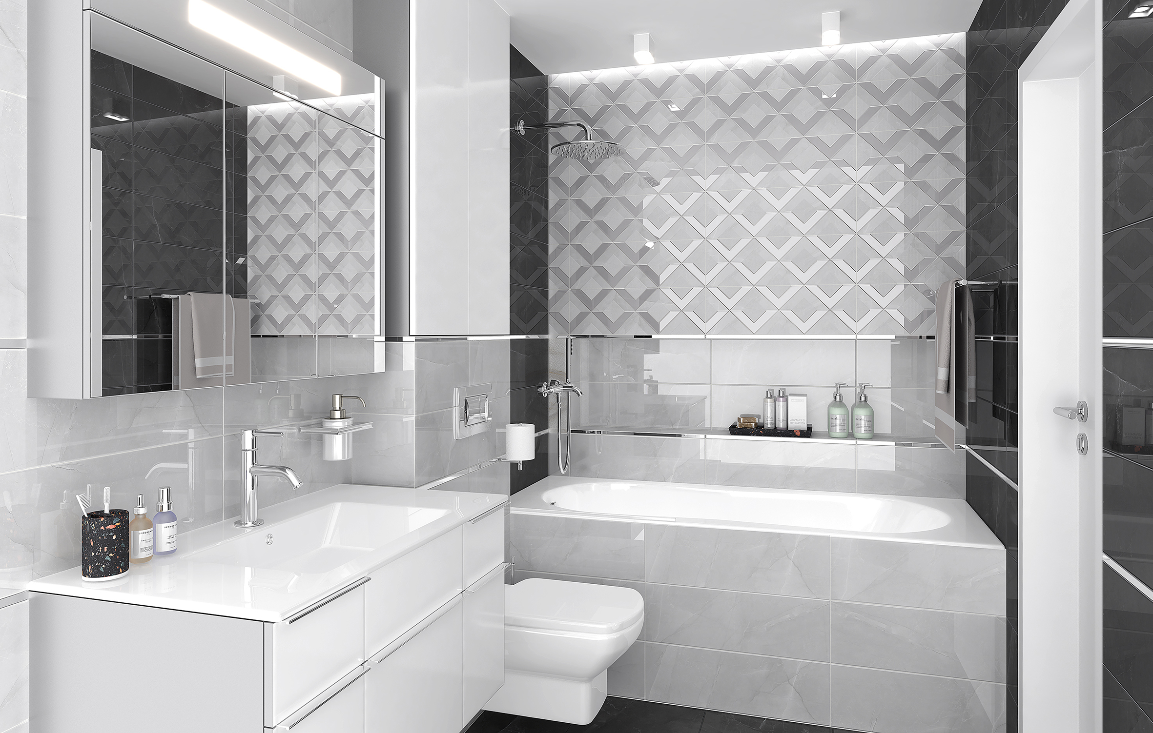 Черное, серое, белое… Скучно? Возможно, но только не у нас! Да, коллекция Monti выполнена в этих цветах. но цвет - это еще не все. Мы максимально оживили этот керамогранит. Глядя на оформленный им интерьер на ум может прийти строгость, стиль, современность, динамика, да все, что угодно, но только не скука! Фон - благородный и спокойный, под натуральный камень. Его противовес - декоры. Именно они придадут оформлению такой характер, какой вы захотите. Мозаика предоставляет свободу творчества, а у геометрического узора другая «фишка»: обрамленные металлическим напылением темные полосы имеют зеркальный эффект.