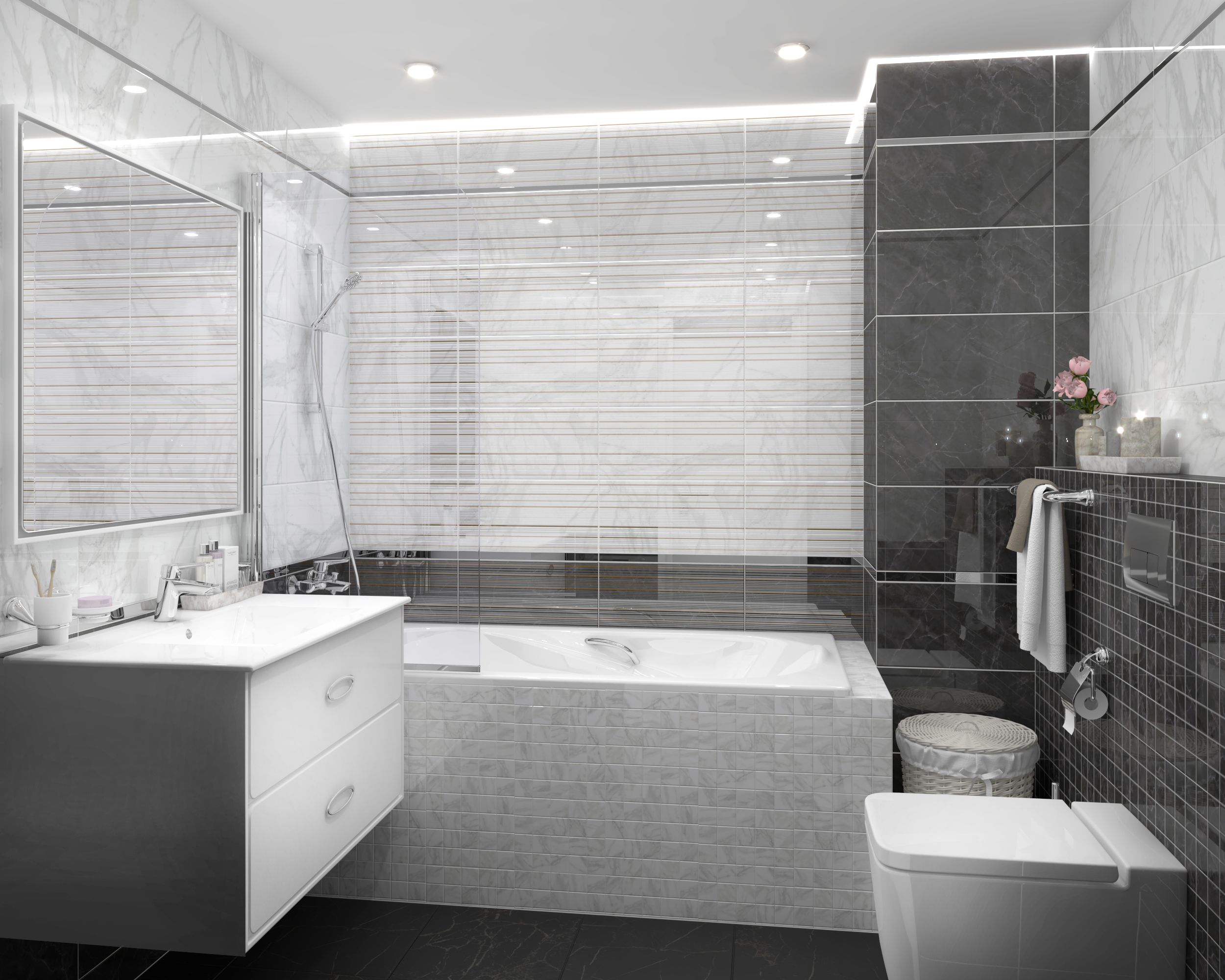 Декор Grand оживит интерьер. Геометрический орнамент с растительными узорами помогает разнообразить базовую плитку под мрамор, не выделяясь из чёрно-белой гаммы. Узор в ромбе покрыт ветрозой с блёстками, большой узор с шероховатой фактурой сверкает на свету.